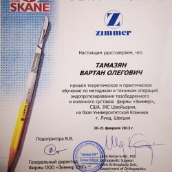 - Эндопротезирование тазобедренного и коленного суставов фирмы «Zimmer». Практическое и теоретическое обучение в Университетской клинике г. Лунд. Швеция.