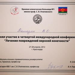 - IV Краснодарская Международная конференция “Лечение повреждений верхней конечности». Краснодар.