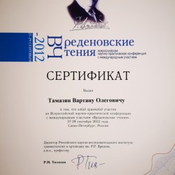 - Юбилейная научно-практическая конференция ГВКГ им. Н.Н. Бурденко: «Организационно-клинические аспекты и перспективы травматологии и ортопедии в многопрофильном лечебном учреждении». Участник конференции. Москва