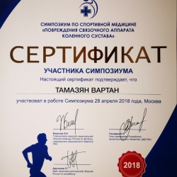- Симпозиум по спортивной медицине «Повреждения связочного аппарат коленного сустава». Участник симпозиума. ЦКБ РАН Москва